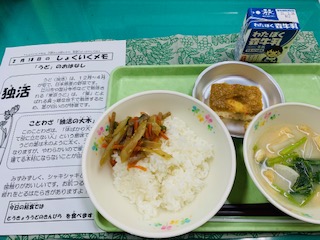 2月18日木曜日 公開日 2021/02/18 更新日 2021/02/18 給食の献立 きょうのこんだて ご飯、豆腐の田楽風焼き、東京うどのきんぴら、かぶの味噌汁、牛乳です。 江戸東京野菜に認定されている東京うどを使いきんぴらを作りました。 香りが教室に広がります。 iPhoneから送信 いいね(0)