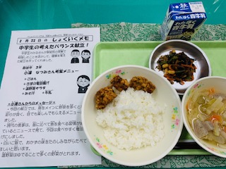 四谷中の女子中学生が小学校の皆さんのために栄養バランスの取れた献立を考えてくれました。