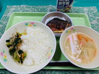 ご飯、鯖のごま風味焼き、野菜の彩り和え、呉汁、牛乳です。