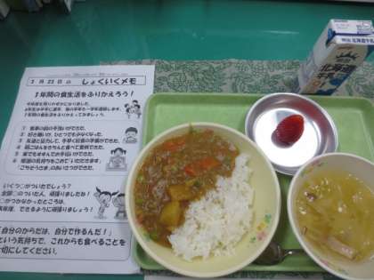 カレーライス、キャベツスープ、果物(いちご)