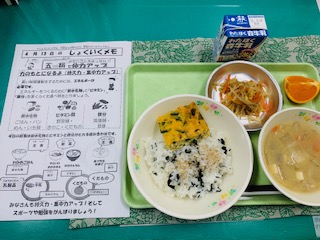4月13日(火) 公開日 2021/04/13 更新日 2021/04/13 給食の献立 きょうのこんだて わかめご飯、厚焼き卵、野菜のおかか和え、味噌けんちん、果物せとか、牛乳です。 きょうは、五つの輪で体力アップメニューから、持久力、集中力アップとして炭水化物、ビタミン類、鉄分を多く含んだ献立になっています。 iPhoneから送信 いいね(0)