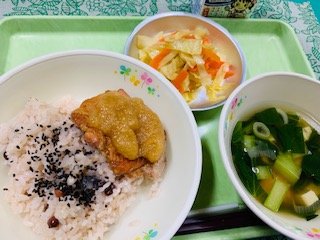 4月14日(水) 公開日 2021/04/14 更新日 2021/04/14 給食の献立 きょうのこんだて お赤飯、鶏肉の照り焼きおろしソース、春のお吸い物、ピリ辛キャベツ、牛乳です。 進級をお祝いしてお赤飯を炊きました。お吸い物には桜の型抜きしたかまぼこをあしらい、春を表現しています。 iPhoneから送信 いいね(0)