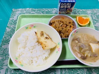 ご飯、いかのねぎ塩焼き、田舎汁、切り干し大根の煮物、果物清美オレンジ、牛乳です。