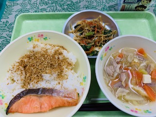 4月21日(水) 公開日 2021/04/24 更新日 2021/04/24 給食の献立 きょうのこんだて ご飯、じゃこふりかけ、鮭の塩焼き、豚汁、胡麻和え煮、牛乳です。 ふりかけは、ちりめんじゃこ、鰹節粉、白胡麻、酒、醤油で炒り煮にして手作りした物です。簡単ですのでお試しください。 iPhoneから送信 いいね(0)