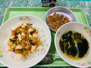 マーボー丼、わかめスープ、アーモンド黒糖、牛乳です。