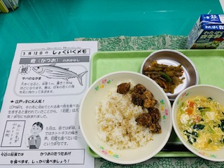 5月13日(木) 公開日 2021/05/14 更新日 2021/05/14 給食の献立 きょうのこんだて じゃこご飯、鰹の竜田揚げ、きんぴら、かきたま汁、牛乳です。 旬の鰹を生姜醤油に漬け込み、片栗粉をまぶしてカラッと揚げました。 初夏を感じる一品です。 iPhoneから送信 いいね(0)