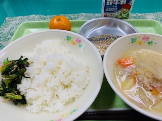 6月2日(水) 公開日 2021/06/03 更新日 2021/06/03 給食の献立 きょうのこんだて ごはん、鯵のねぎ塩焼き、豚汁、小松菜とえのきの海苔和え、果物冷凍みかん、牛乳です。 焼き海苔で佃煮を作り茹でた小松菜とエノキを和えました。ご飯の進む一品です。 iPhoneから送信 いいね(0)