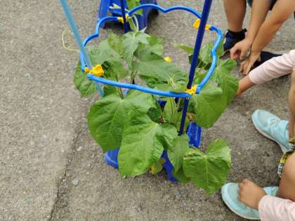 1年生が育てているアサガオが大きくなってきたので、支柱を立てました。