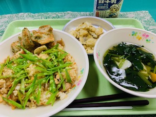 6月24日(木) 公開日 2021/06/24 更新日 2021/06/24 給食の献立 きょうのこんだて とりごぼうご飯、ちくわの磯辺揚げ、 すまし汁、キャベツのピリ辛炒め、牛乳です。 ちくわを四分の一に切っていた磯辺あげですが、前歯の生え変わる一年生にはガブリつくのが難しそうで、今回は乱切りにしてみました。 iPhoneから送信 いいね(0)