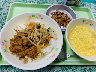 ビビンバ、コーンと卵のスープ、アーモンド黒糖、牛乳です。