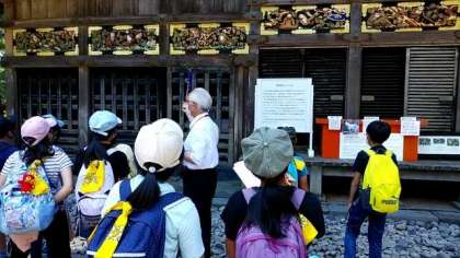 門を入り右側に想像の象、左側に有名な三猿の彫刻があります。