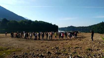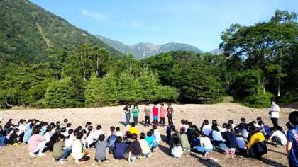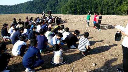 おはようございます。6時に起床して湯の湖の湖畔まで行き朝の会をしました。去年踊ったマイムマイムを踊りました。