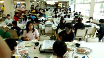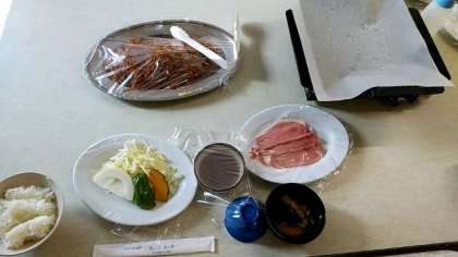 昼食です。肉と野菜を自分たちで焼いて食べます。焼きそばもあります。