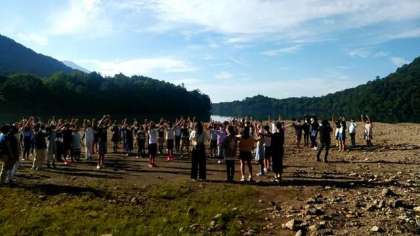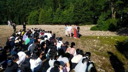 おはようございます。6時に起床しました。湯の湖まで歩いて行き朝の会をしました。命令ゲームで体を動かしました。