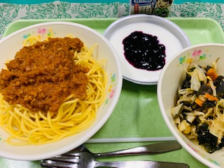 9月2日(木) 公開日 2021/09/02 更新日 2021/09/02 給食の献立 きょうのこんだて スパゲティミートソース、わかめサラダ、ヨーグルトの恩方ブルーベリーソース、牛乳です。 きょうのブルーベリーソースは恩方で収穫されたものを給食室でコトコトと煮込んだものです。甘酸っぱいソースがヨーグルトに合います。 iPhoneから送信 いいね(0)