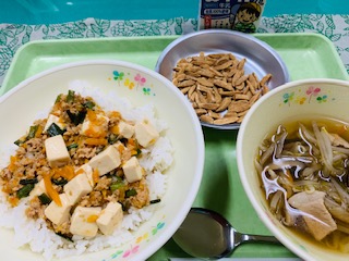 マーボー丼、もやしのスープ、アーモンド黒糖、牛乳です。