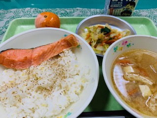 五穀ごはん、鮭の塩焼き、豚汁、おひたし、果物冷凍みかん、牛乳です。