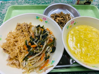 ビビンバ、コーンと卵のスープ、ごまめナッツ、牛乳です。