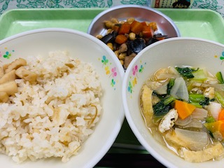 八王子産しょうがご飯、イカの煮物、五目煮豆、はっちくん味噌汁、牛乳です。