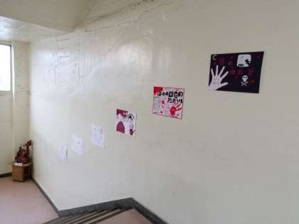 階段に、五小フェスティバルのポスターが貼られました。いよいよ来週です。