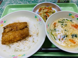 10月28日(木) 公開日 2021/11/01 更新日 2021/11/01 給食の献立 きょうのこんだて 秋刀魚の蒲焼丼、キャベツの生姜風味、かきたま汁、牛乳です。 秋刀魚の美味しい季節になりました。生姜醤油に漬け込み片栗粉をまぶした秋刀魚をカラッと揚げ甘辛だれにくぐらせました。 iPhoneから送信 いいね(0)
