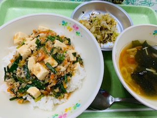 ごはん、麻婆豆腐、わかめとえのきのスープ、じゃこキャベツ、牛乳です。