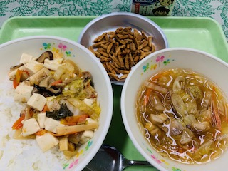 ごはん、豆腐の旨煮、春雨スープ、アーモンド黒糖、牛乳です。