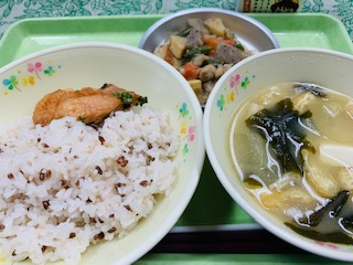 古代ご飯、鶏肉の七味焼き、筑前煮、味噌汁、牛乳です。
