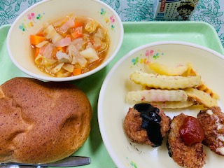 1月20日(木) 公開日 2022/01/20 更新日 2022/01/20 給食の献立 きょうのこんだて 胚芽パン、疫病退散Dr.肥沼ランチ、アイントップフ 、牛乳です。 きょうの給食は、9月に行われたこども屋台選手権でグランプリを取った第三小学校の献立です。団子のソースはドイツの国旗の色を模しています。 ポテトには桜の花をあしらいました。 iPhoneから送信 いいね(0)