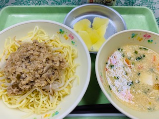 じゃーじゃー麺、サンラータン、果物りんご缶、牛乳です。