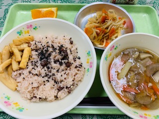 3月2日(水) 公開日 2022/03/02 更新日 2022/03/02 給食の献立 きょうのこんだて お赤飯、いかの香味焼き、野菜おかか和え、沢煮椀、果物清美オレンジ、牛乳です。 6年生を送る会をしました。給食でもお祝い献立です。 iPhoneから送信 いいね(0)