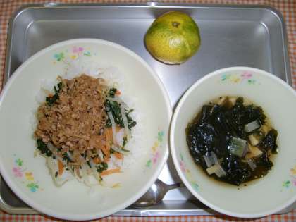 ビビンバ、いためわかめのスープ、くだもの、ぎゅうにゅう