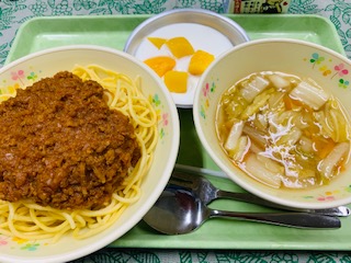 スパゲティミートソース、白菜スープ、ピーチヨーグルト、牛乳です。