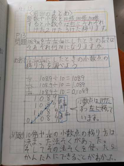自ら学び、考える 公開日 2022/04/18 更新日 2022/04/18 五小の生活 高学年の児童の算数ノートです。とても丁寧にまとまっています。素晴らしいのは、学習の始めに「前回のまとめ」を自分で考えて書いているところです。黒板に書かれたことだけではなく、自分でノートをデザインできるようになると、ぐんぐん伸びていきます。とてもお手本となるノートです。 いいね(0)