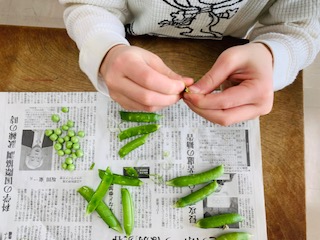 きょうの給食で使うグリンピースは、2年生とみどり学級で朝一番に向いてくれたものです。全部で7キロ。形や匂いなどを感じながらむいてくれました。