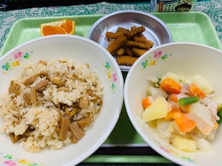 筍ごはん、いかの松笠煮、塩肉じゃが、果物、牛乳です。