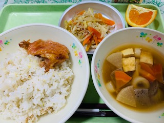 5月16日(月) 公開日 2022/05/17 更新日 2022/05/17 給食の献立 きょうのこんだて 五穀ごはん、鶏肉のピリ辛焼き、のっぺい汁、じゃこと野菜のニンニク風味、果物きよみオレンジ、牛乳です。きょうの献立は、五つの星、つまり主食、主菜、副菜、汁物、果物5つがバランスよくそろった献立です。 今まで、オリンピックにあやかり五つの輪で登場してきましたが、今月から、五つの星でお知らせしていきます。 iPhoneから送信 いいね(0)