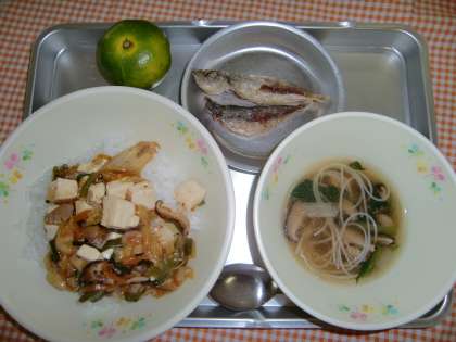 チゲどうふどん、まめあじのからあげ、ビーフンスープ、くだもの、ぎゅうにゅう