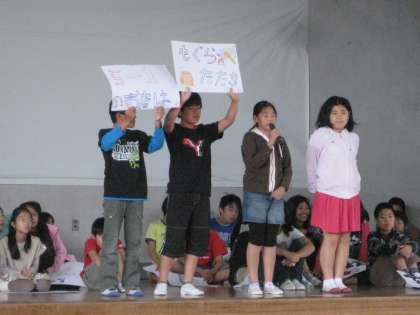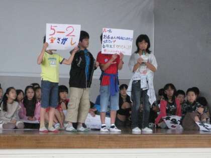 今日の児童集会は、明日行われる「五小まつり」の宣伝でした。
