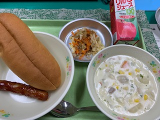 6月23日(木) 公開日 2022/06/29 更新日 2022/06/29 給食の献立 きょうのこんだて ウインナーサンド、クリームシチュー、じゃこサラダ、りんごジュースです。 1年生は、初めてのリンゴジュースです。 iPhoneから送信 いいね(0)