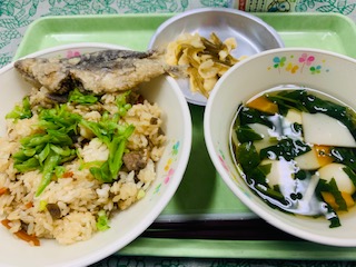 とりごぼうごはん、豆味の唐揚げ、すまし汁、キャベツのピリ辛炒め、牛乳です。