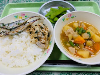 7月6日(水) 公開日 2022/07/08 更新日 2022/07/08 給食の献立 きょうのこんだて ご飯、ししゃもの磯辺焼き、とりじゃが、梅おかかキャベツ、枝豆、牛乳です。 きょうの枝豆は、こんだて八王子産です。小比企や上柚木から採れたて新鮮な枝豆が届きました。あまくておいしいです。 iPhoneから送信 いいね(0)