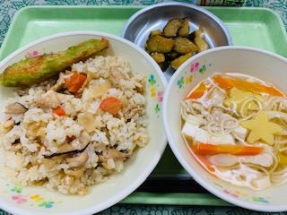 7月7日(木) 公開日 2022/07/08 更新日 2022/07/08 給食の献立 きょうのこんだて ちらし寿司、笹の葉揚げ、胡麻きゅうり、七夕汁、牛乳です。 きょうは七夕、給食でも七夕にちなんだ献立にしました。笹かまぼこに桑の葉粉を入れた衣をつけ、油で揚げました。笹をイメージしています。 iPhoneから送信 いいね(0)