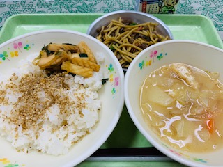 ごまごはん、イカの七味煮、変わりきんぴら、具だくさん味噌汁、牛乳です。