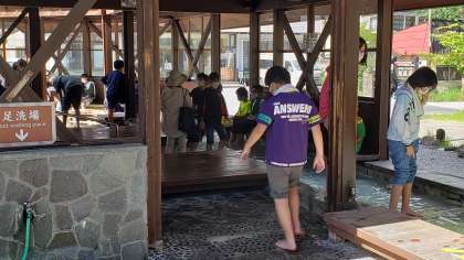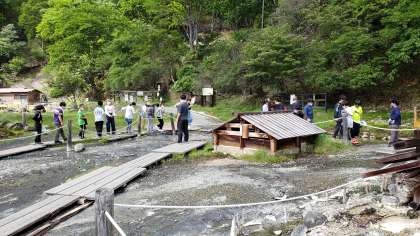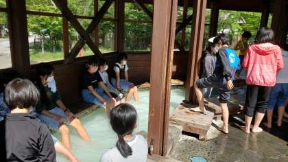 宿舎に戻り、周辺散策をしました。足湯で今日の疲れを癒し、宿舎の温泉の源泉も見てきました。