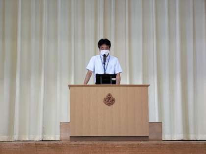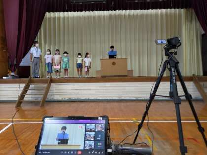 1学期の終業式は、体育館からオンラインで各教室に配信しました。