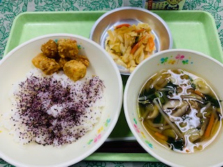 9月15日(木) 公開日 2022/09/15 更新日 2022/09/15 給食の献立 きょうのこんだて ゆかりご飯、白身魚の唐揚げ、もやしスープ、ラー菜、牛乳です。 iPhoneから送信 いいね(0)