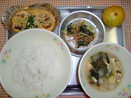 おやこどん、なめこいりみそしる、ごまあえ、くだもの、ぎゅうにゅう