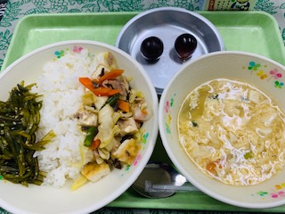 9月22日(木) 公開日 2022/09/22 更新日 2022/09/22 給食の献立 きょうのこんだて ご飯、生揚げの味噌炒め、かき卵汁、茎わかめの胡麻風味、果物巨峰、牛乳です。 iPhoneから送信 いいね(0)