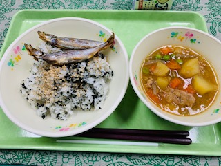 わかめご飯、焼きししゃも、肉じゃが、牛乳です。